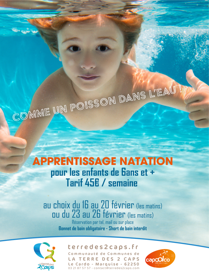 Pour les enfants de 6 ans et plus. Zoom on image Apprentissage de la natation pour les enfants de 6 ans et plus. Tarif 45€ par semaine. Réservation par téléphone, mail ou sur place/ Bonnet de bain obligatoire. Short de bain interdit. Au choix du 16 au 20 février (les matins) ou du 23 au 26 février (les matins) Réservation par téléphone, mail ou sur place. Bonnet de bain obligatoire et short de bain interdit.